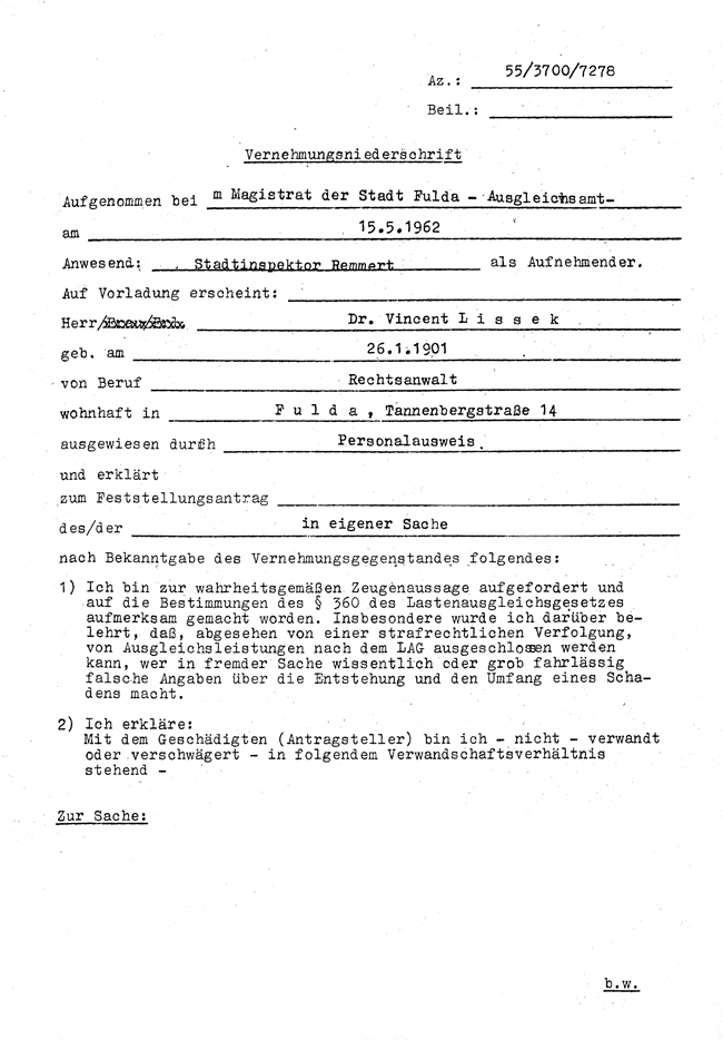 Quelle: Lastenausgleichsakte Dr. Vincent Lissek, Bundesarchiv Bayreuth