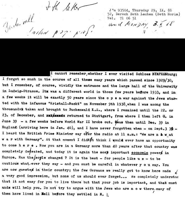 His rejection of everything German went as far as he discontinuing the contact with one of his best friends, Werner Marx, when the latter returned to Germany in 1958 and succeded Martin Heidegger at the University of Freiburg. When his son was for the State of Israel in Munich and Frankfurt from 1987 to 1990 his father could accept this but couldn’t bring himself to visit his son.